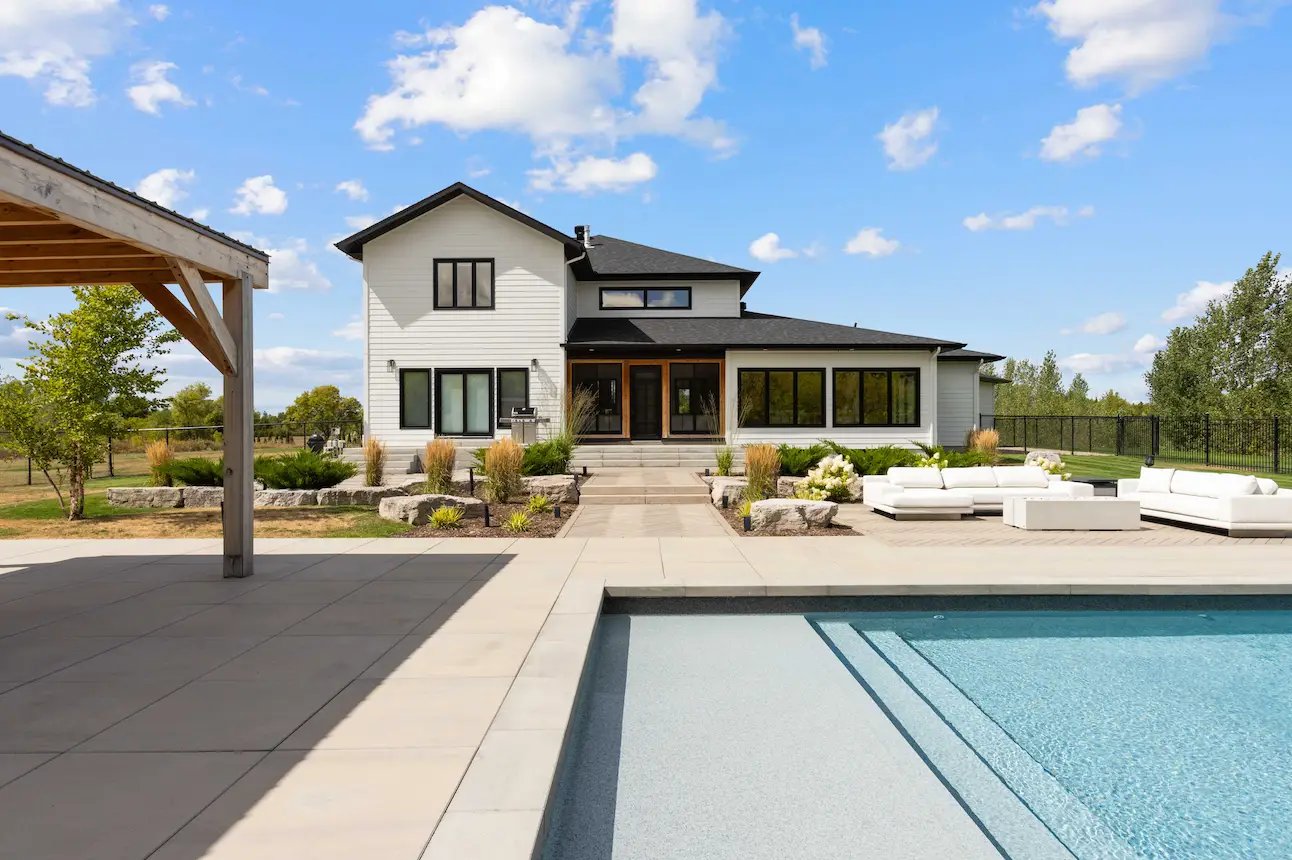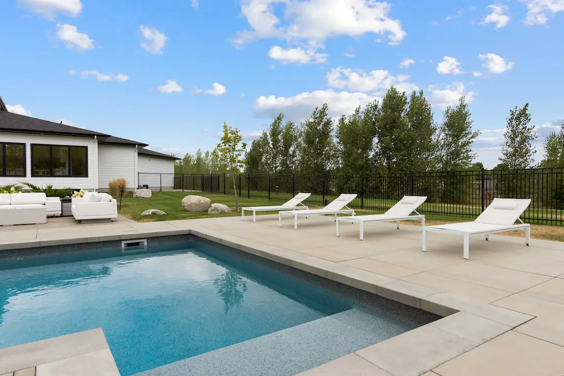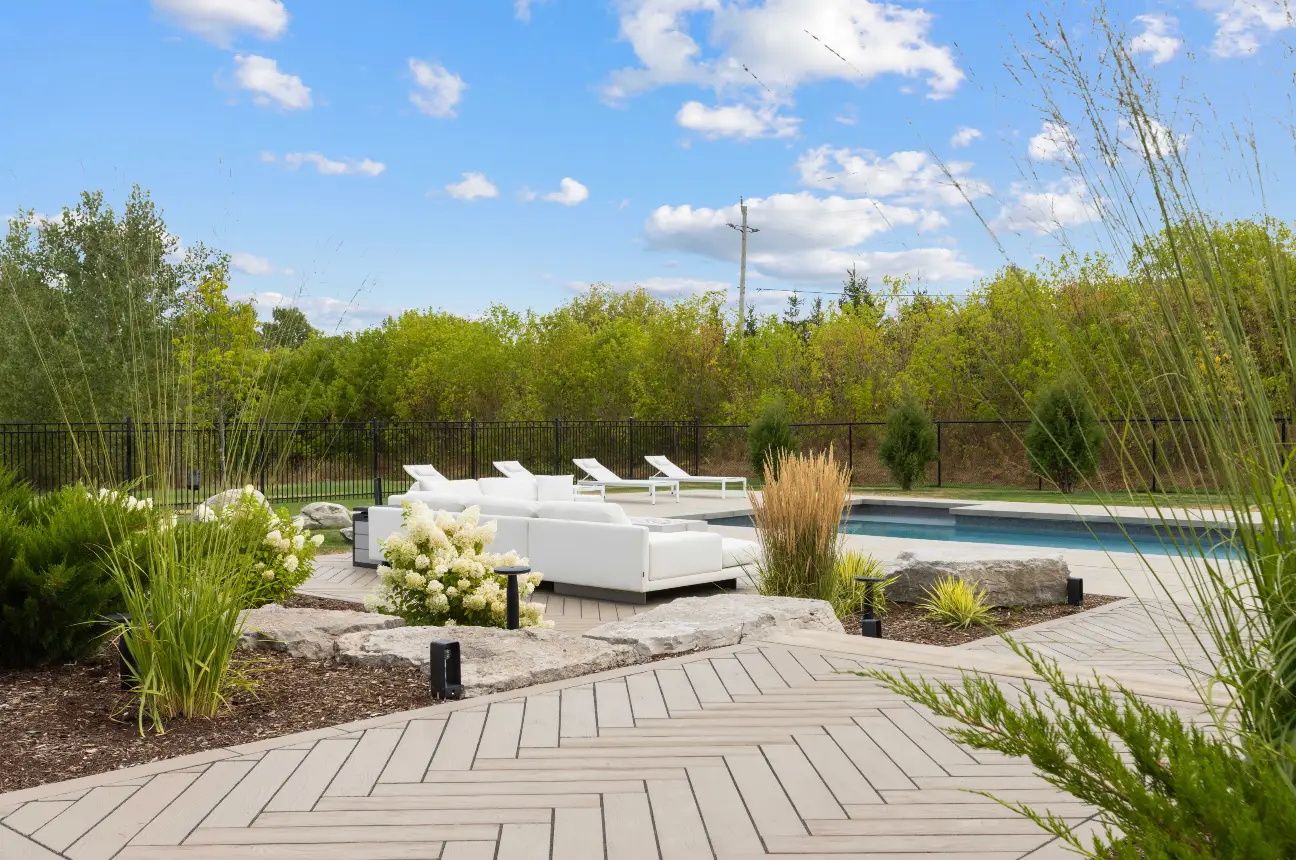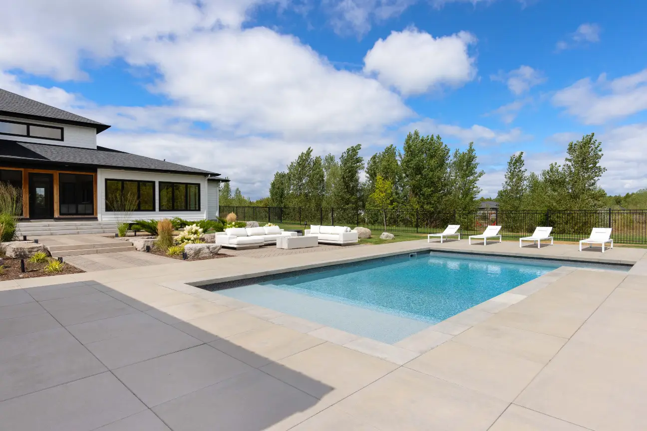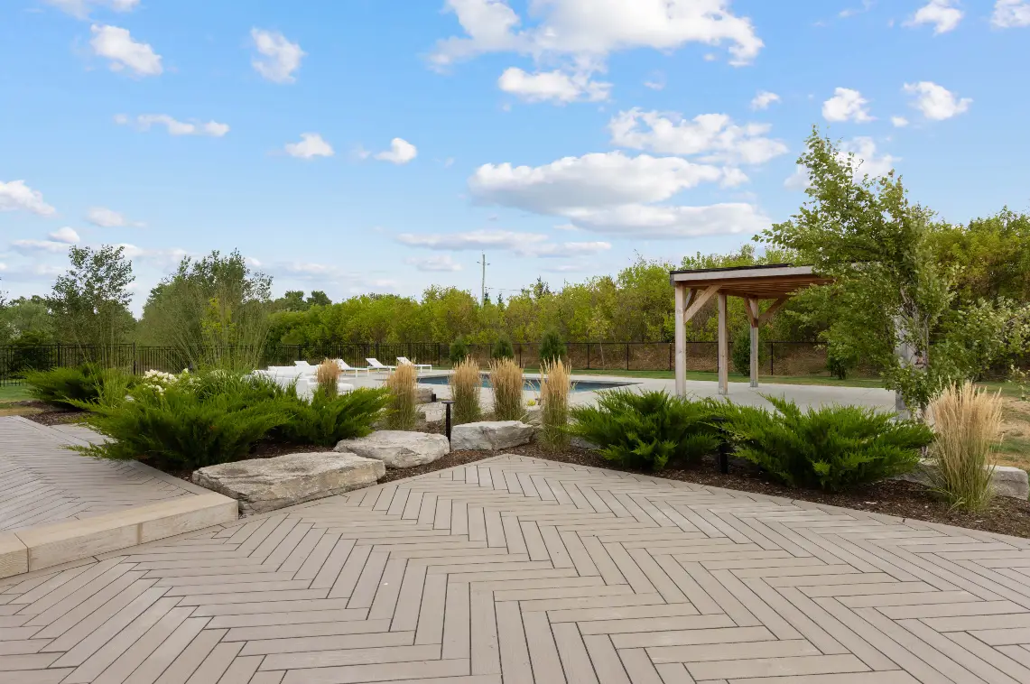 Large 3' x 3' pavers were used to establish a bold architectural framework around the pool, paired with a wood-look slab laid in a herringbone pattern to introduce warmth and texture. Decorative boulders were thoughtfully integrated to soften the overall composition, while a large shade structure provides relief from the sun and creates a future home for an outdoor kitchen. Finished with carefully considered planting, the result is a refined outdoor space that feels balanced, intentional, and striking in its simplicity.