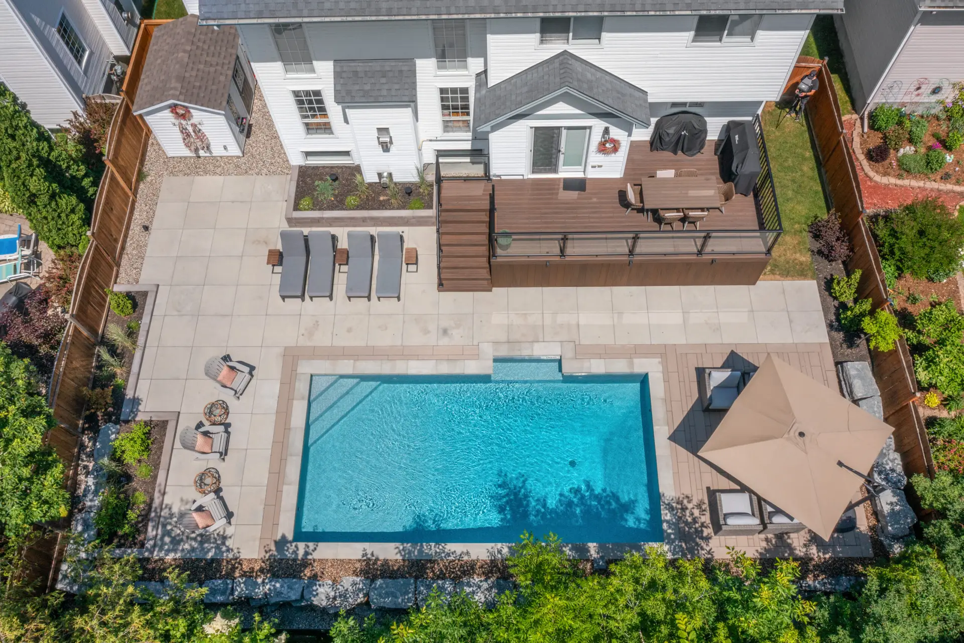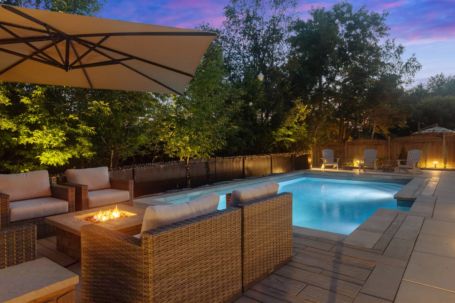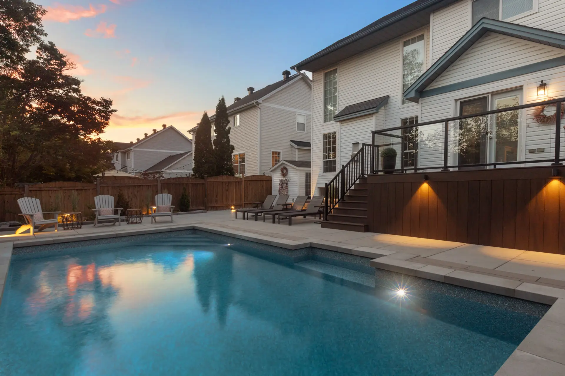 The design introduced a new composite deck with a waterproofed understructure to create dry storage below, while also establishing an upper dining area with a clean, modern presence. An armour stone retaining wall was installed to correct the grade and unlock a more practical layout for the backyard. The space was further defined by a custom pool with integrated bench seating, a material palette of 3' x 3' slabs paired with a wood-look slab to bring warmth and texture, curated planting, and integrated outdoor lighting. The result is a sophisticated backyard retreat that balances structure, comfort, and elegance, both day and night.