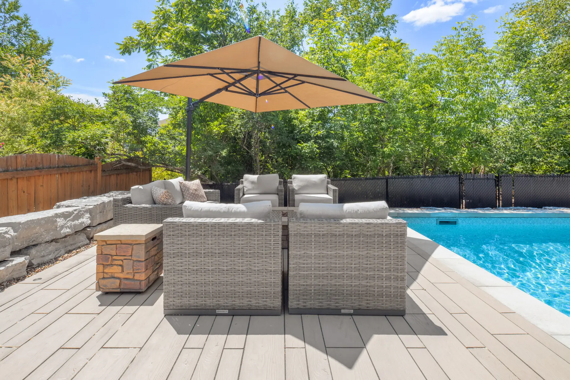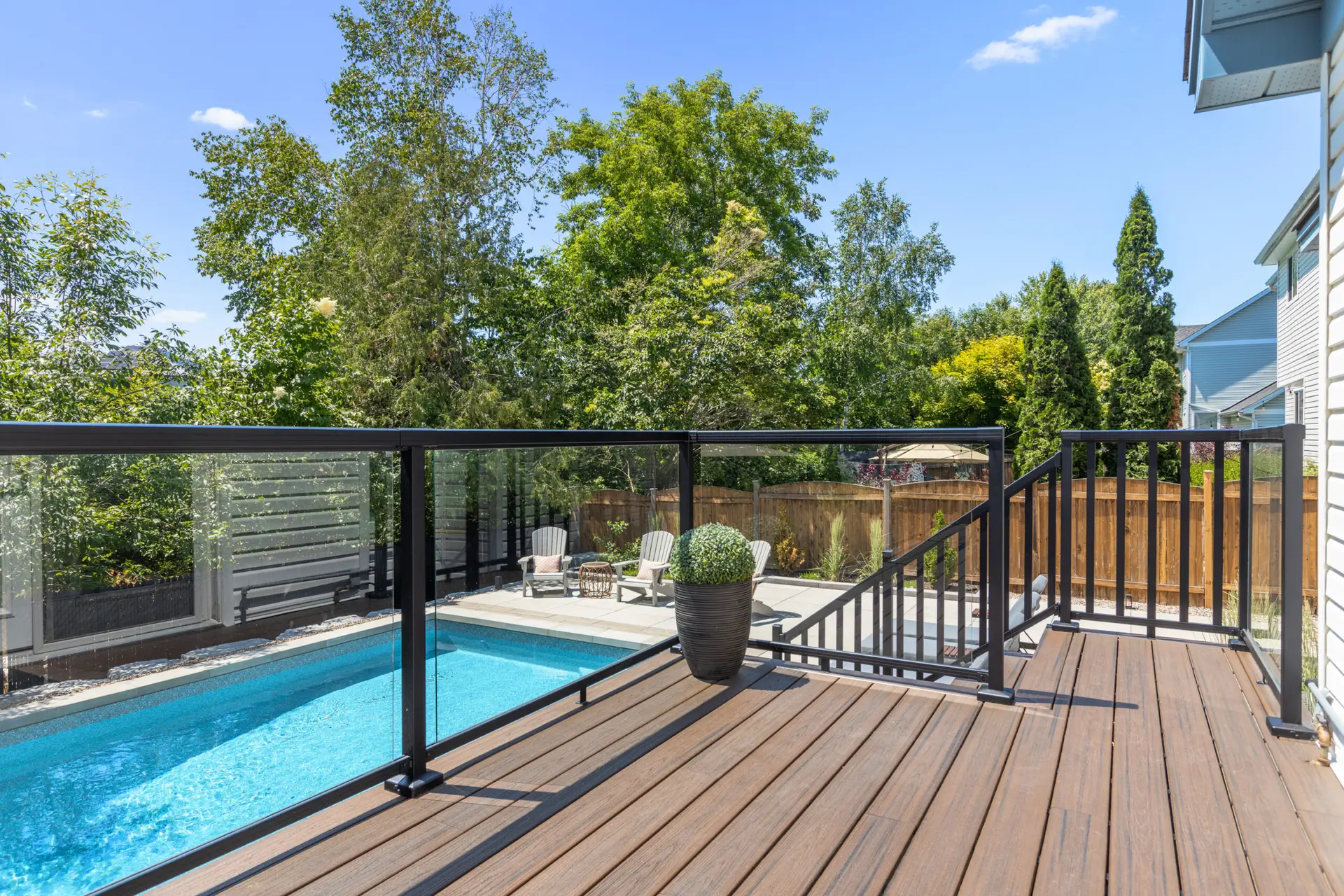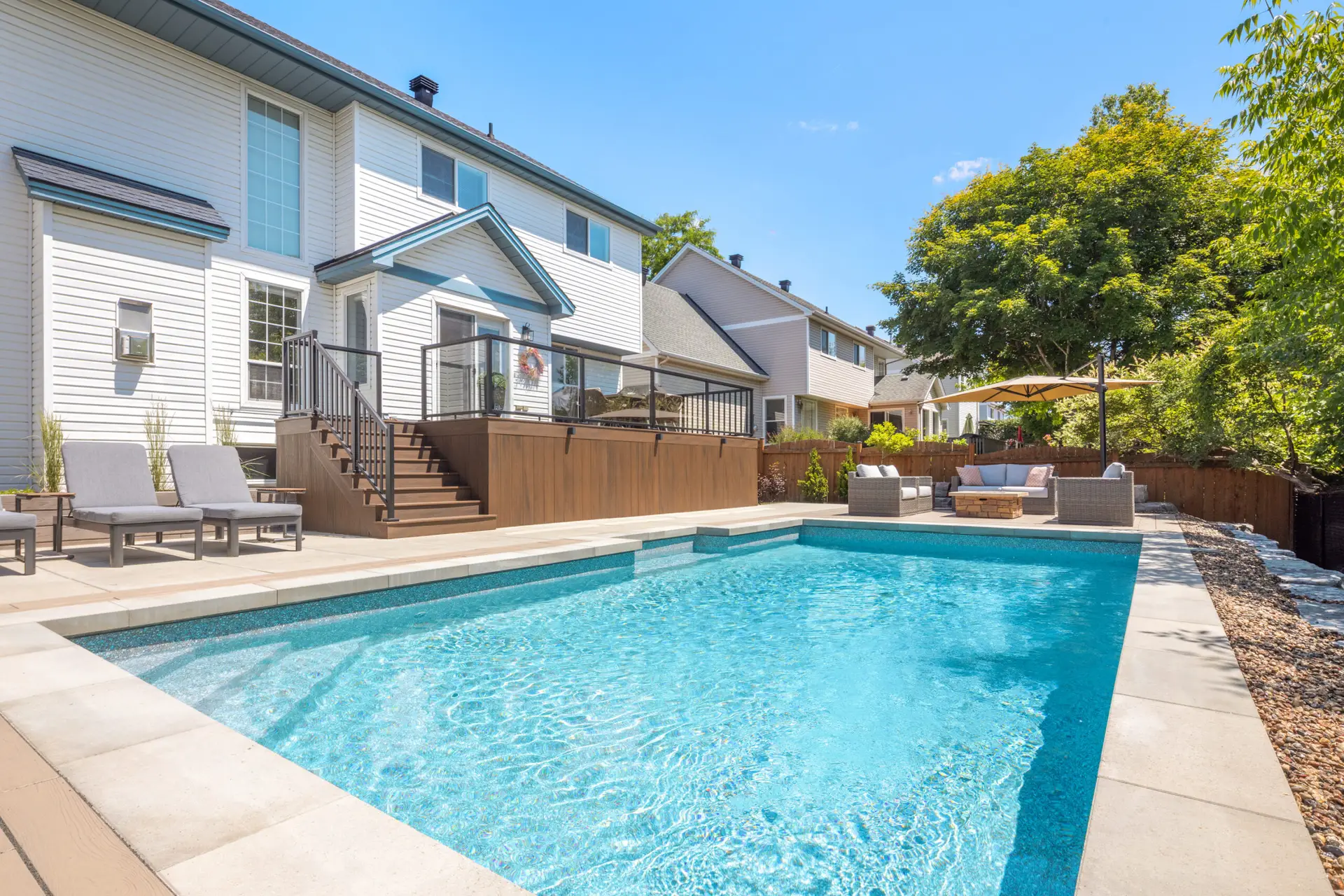 The design introduced a new composite deck with a waterproofed understructure to create dry storage below, while also establishing an upper dining area with a clean, modern presence. An armour stone retaining wall was installed to correct the grade and unlock a more practical layout for the backyard. The space was further defined by a custom pool with integrated bench seating, a material palette of 3' x 3' slabs paired with a wood-look slab to bring warmth and texture, curated planting, and integrated outdoor lighting. The result is a sophisticated backyard retreat that balances structure, comfort, and elegance, both day and night.