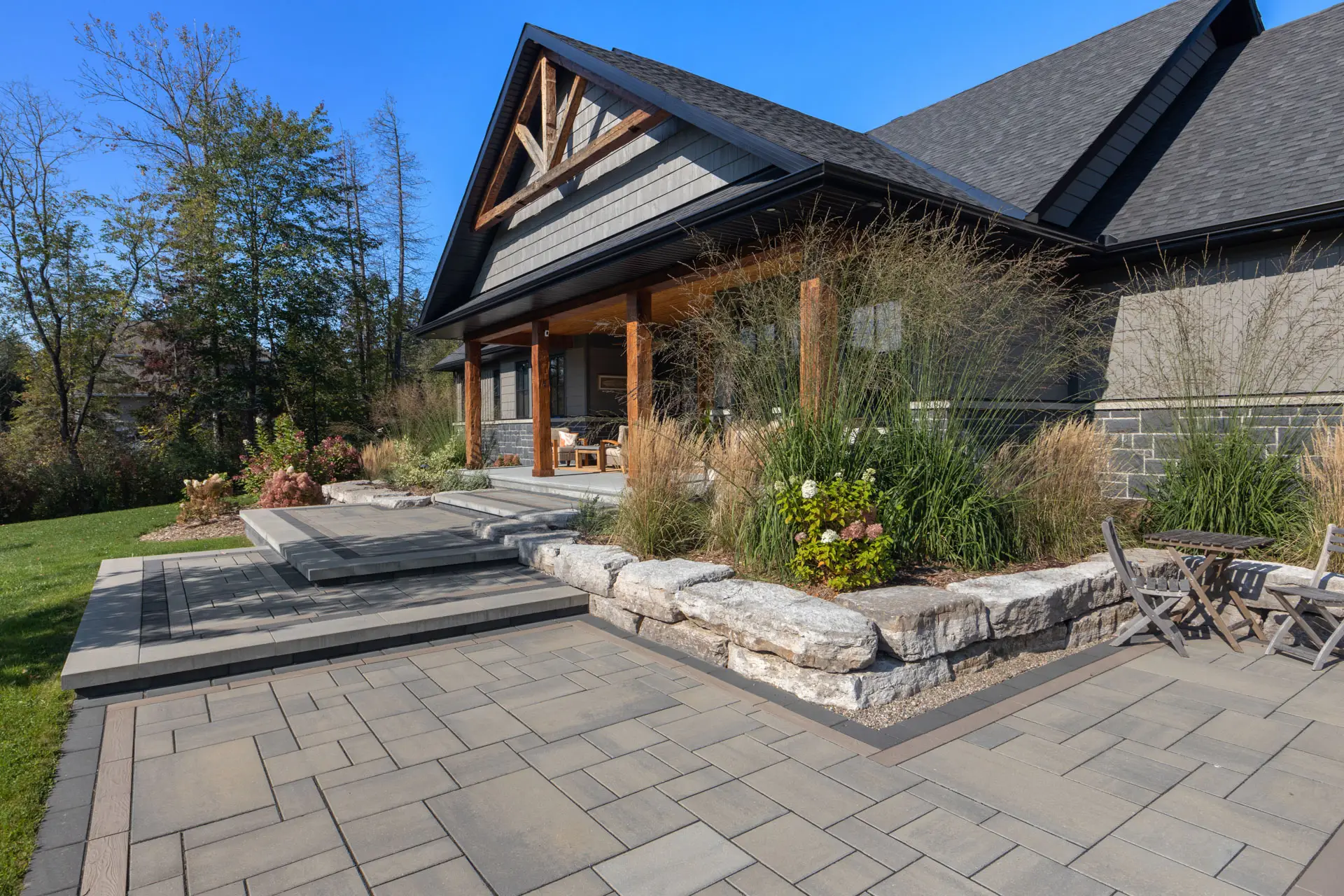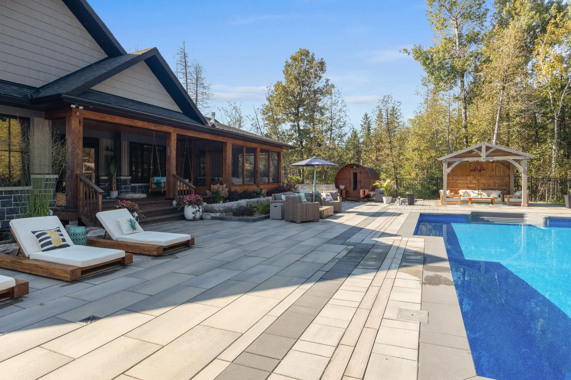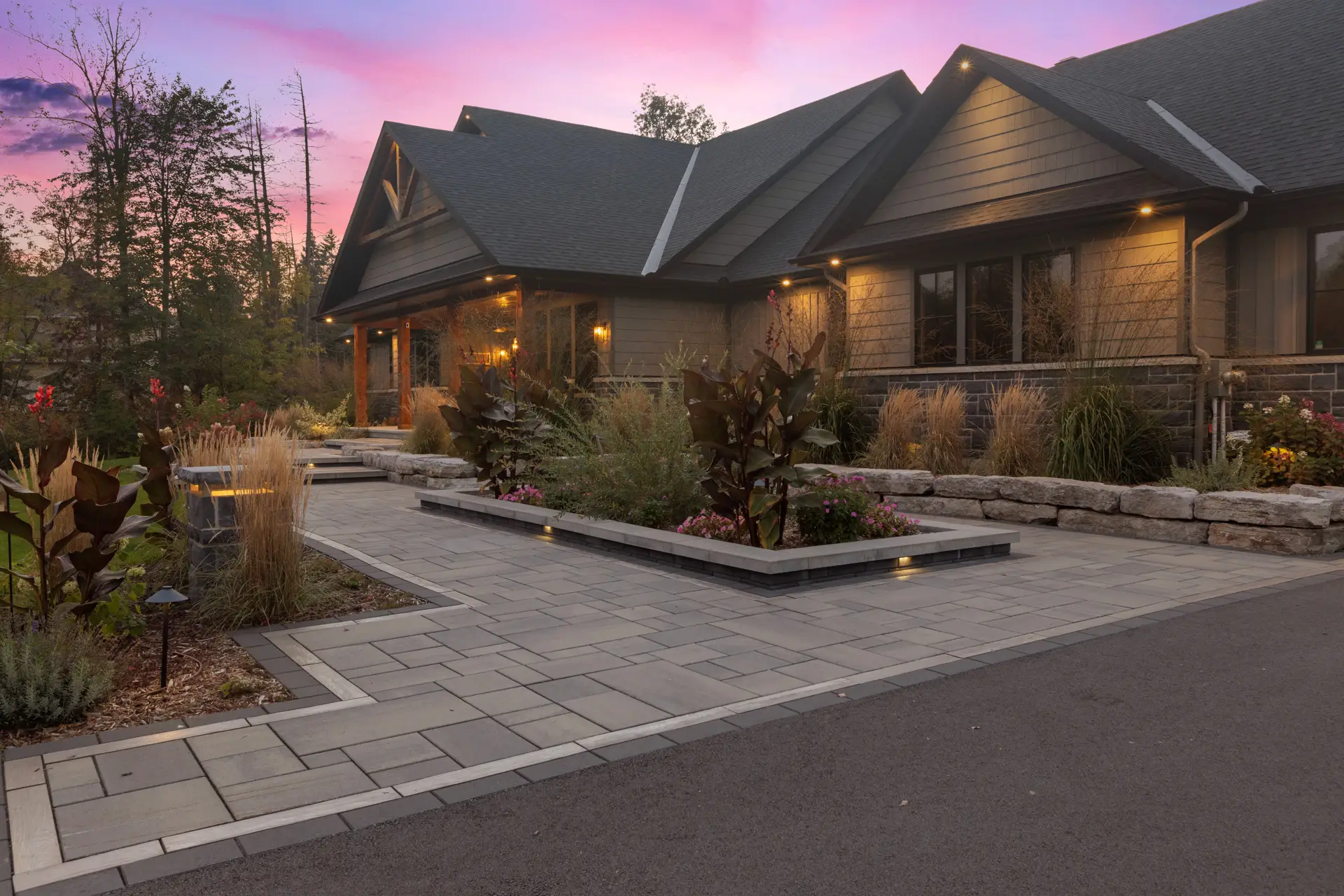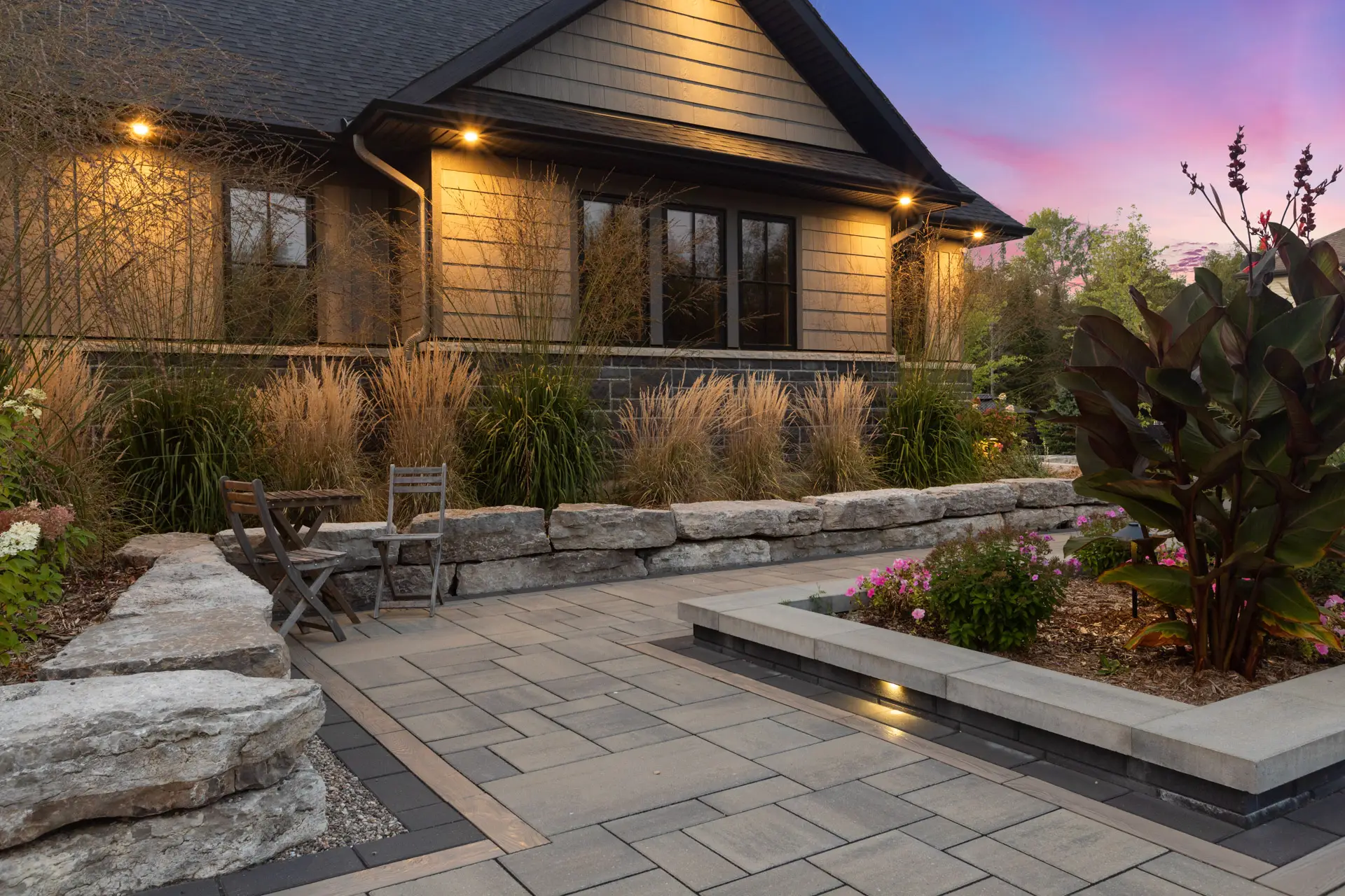 Natural armour stone was used extensively throughout the front and backyard to build strong, textural garden walls that anchor the landscape and reinforce its architectural character. In the front, chunky entry steps were installed to match the scale of the home, while gardens and planting add softness, depth, and a more welcoming sense of arrival. In the backyard, a custom pool with water jets, a gazebo, a sauna, an outdoor kitchen, carefully selected slab inlays, and layered gardens and planting come together to create a highly livable outdoor retreat. Integrated landscape lighting elevates the entire property after dark, giving it the feel of a private resort while highlighting the materials, forms, and setting that make the space so distinctive.
