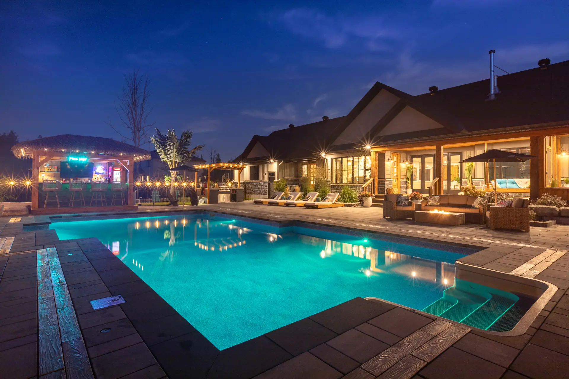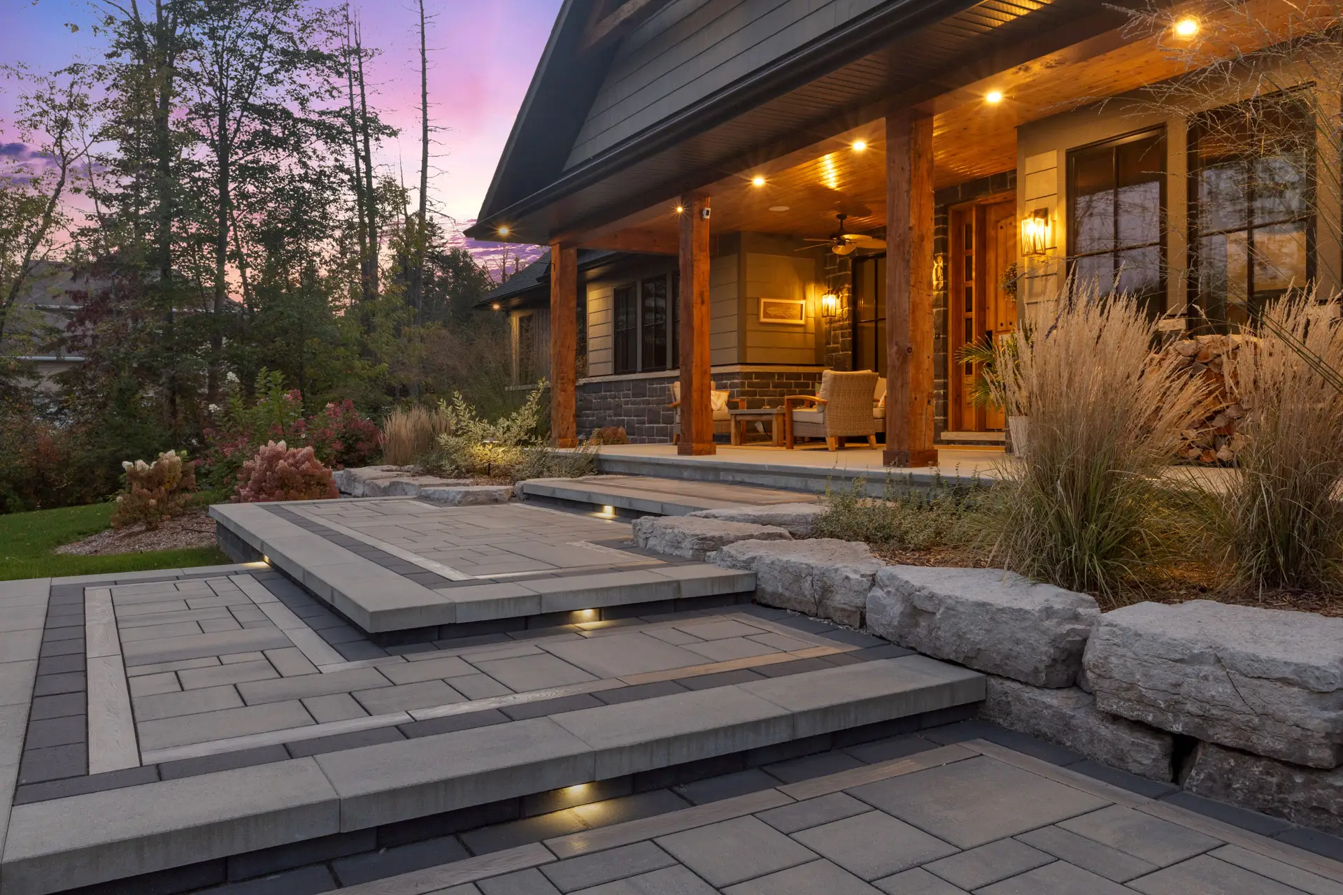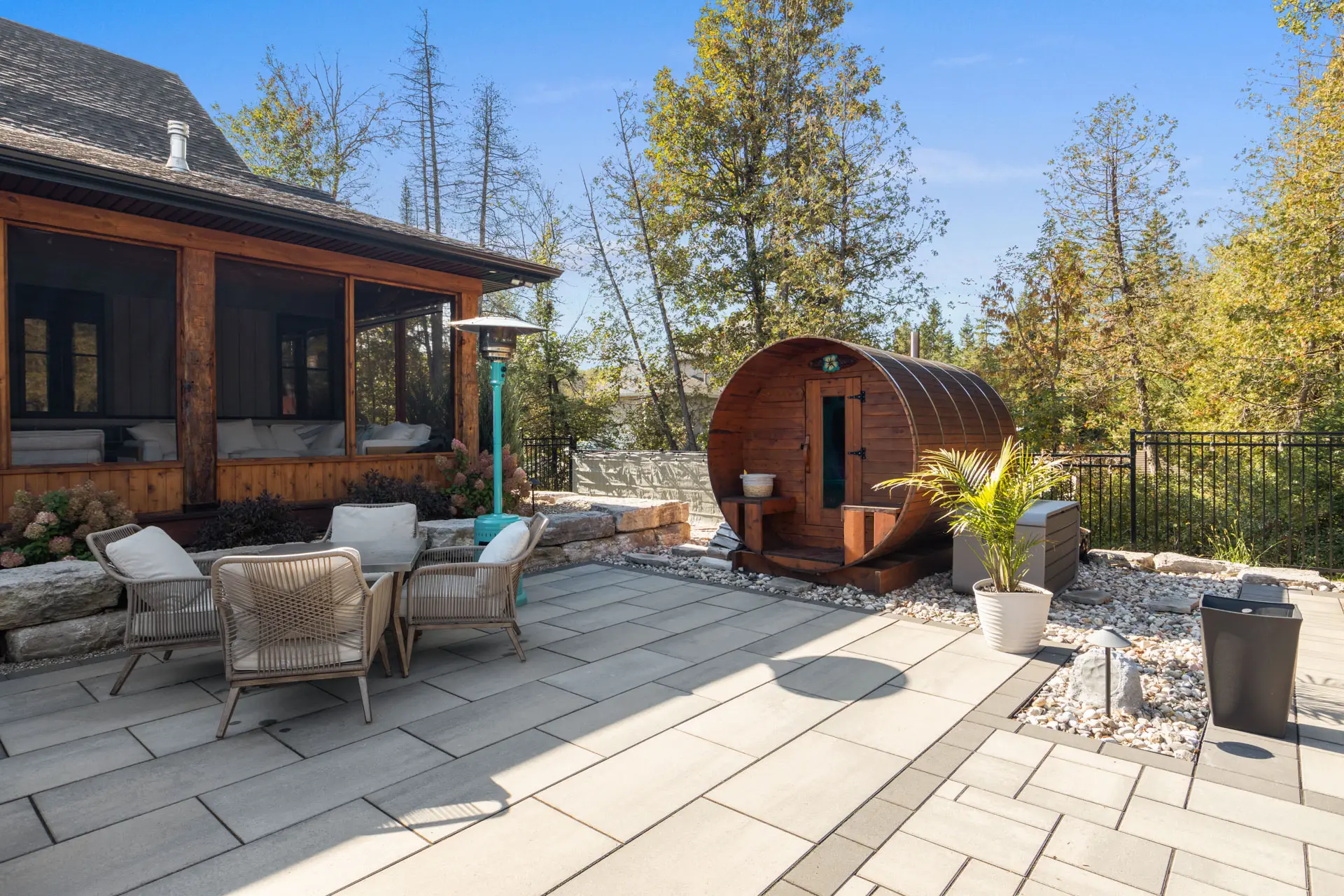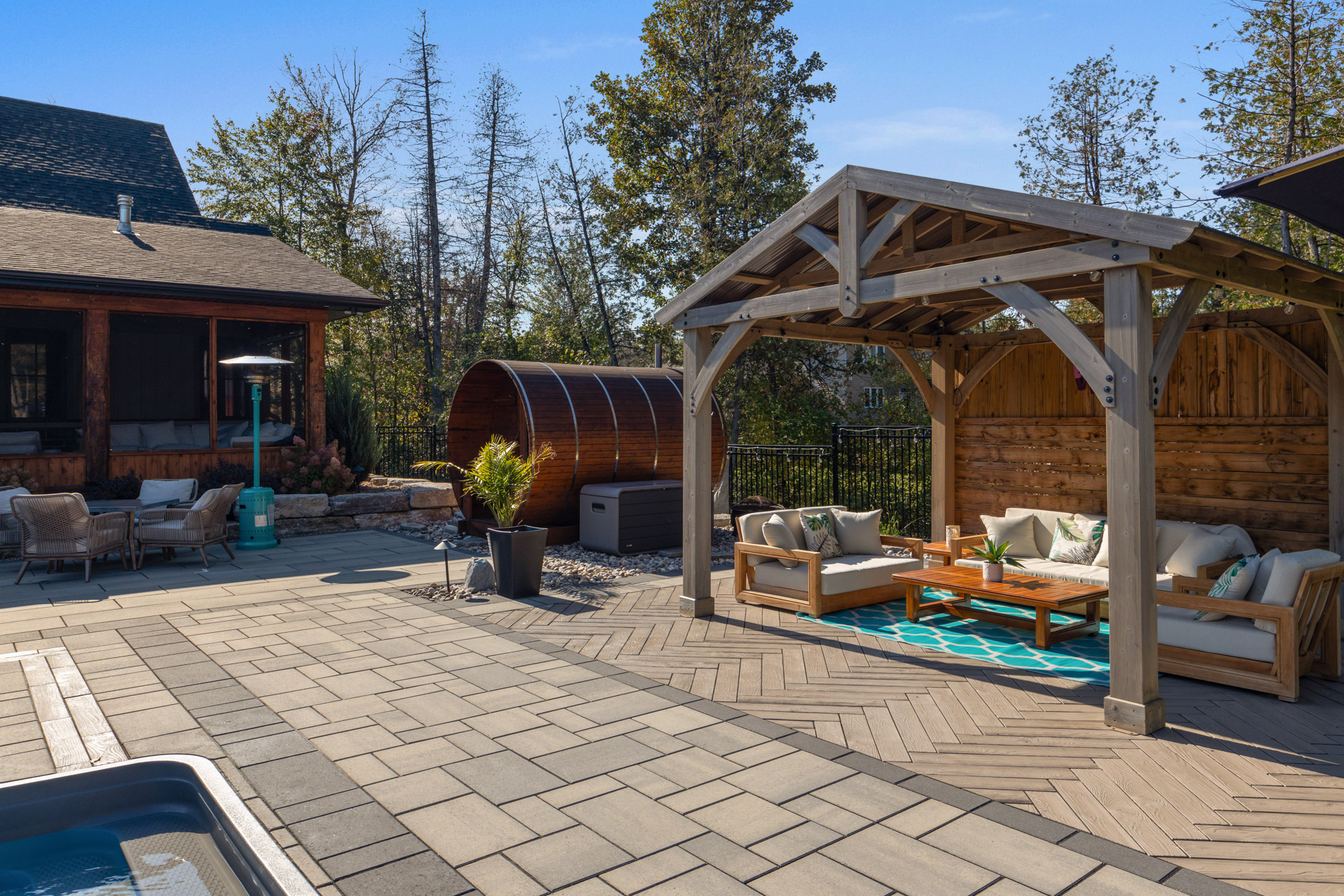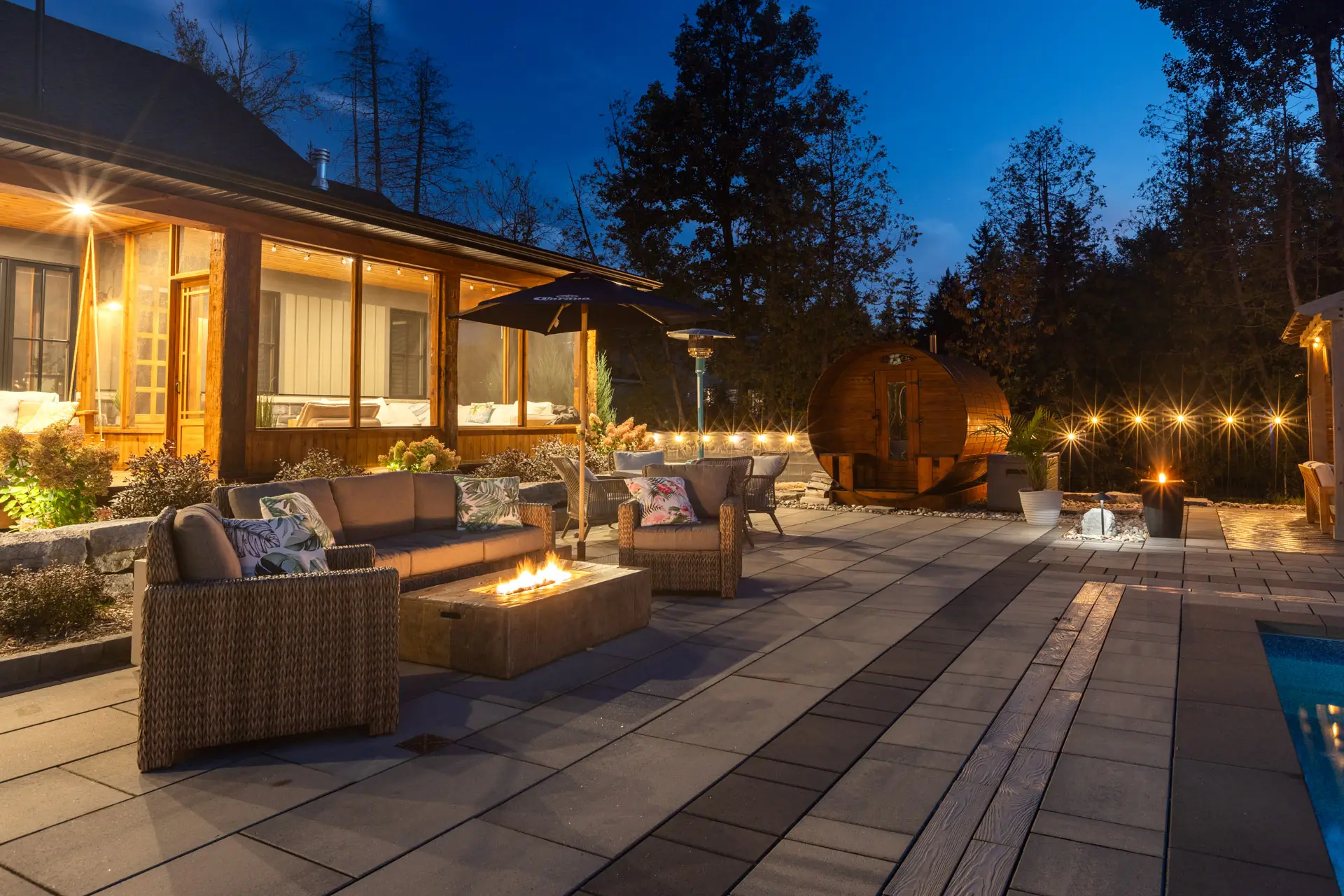 Natural armour stone was used extensively throughout the front and backyard to build strong, textural garden walls that anchor the landscape and reinforce its architectural character. In the front, chunky entry steps were installed to match the scale of the home, while gardens and planting add softness, depth, and a more welcoming sense of arrival. In the backyard, a custom pool with water jets, a gazebo, a sauna, an outdoor kitchen, carefully selected slab inlays, and layered gardens and planting come together to create a highly livable outdoor retreat. Integrated landscape lighting elevates the entire property after dark, giving it the feel of a private resort while highlighting the materials, forms, and setting that make the space so distinctive.