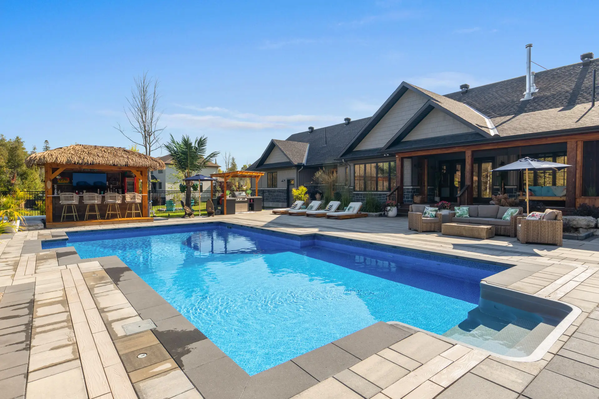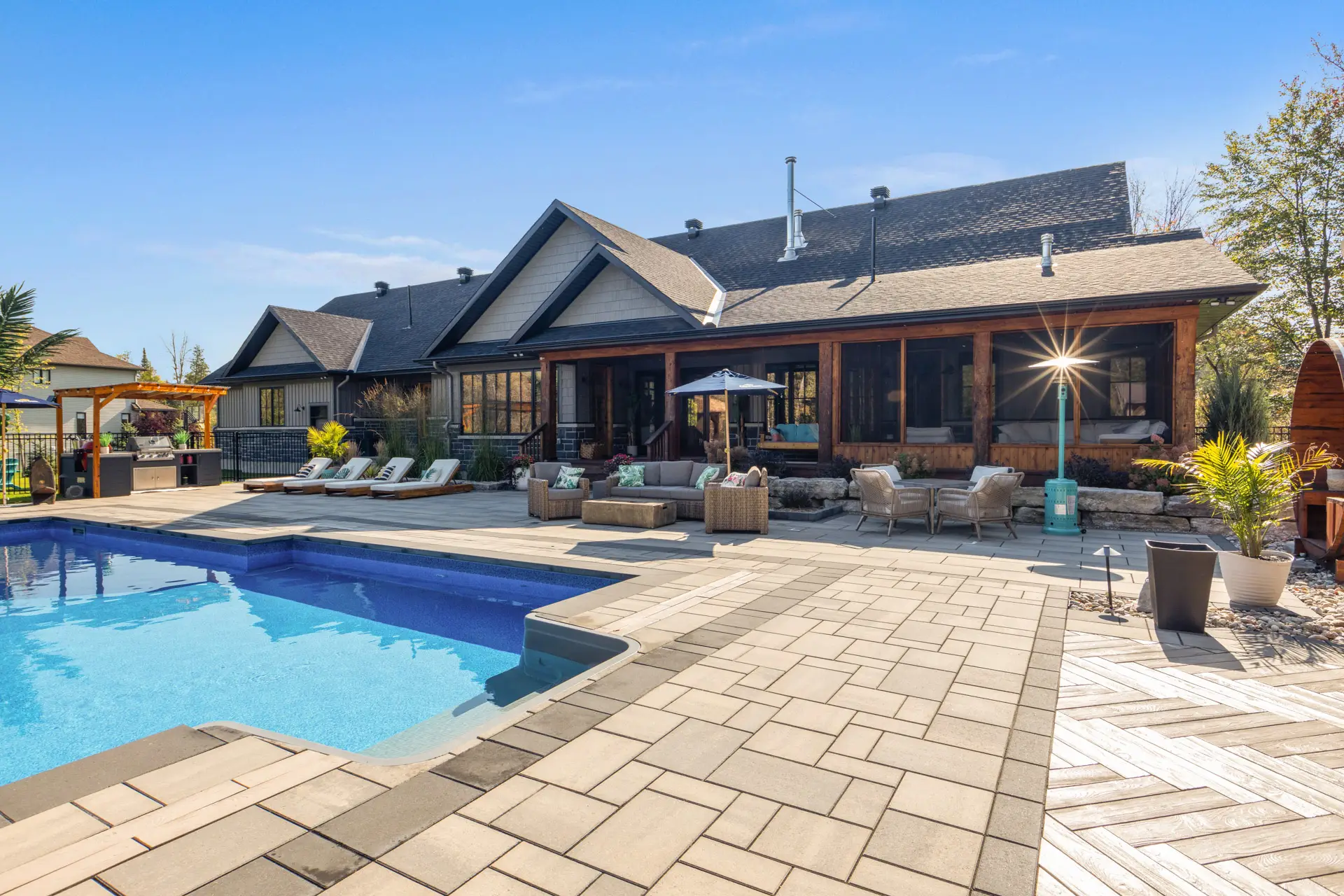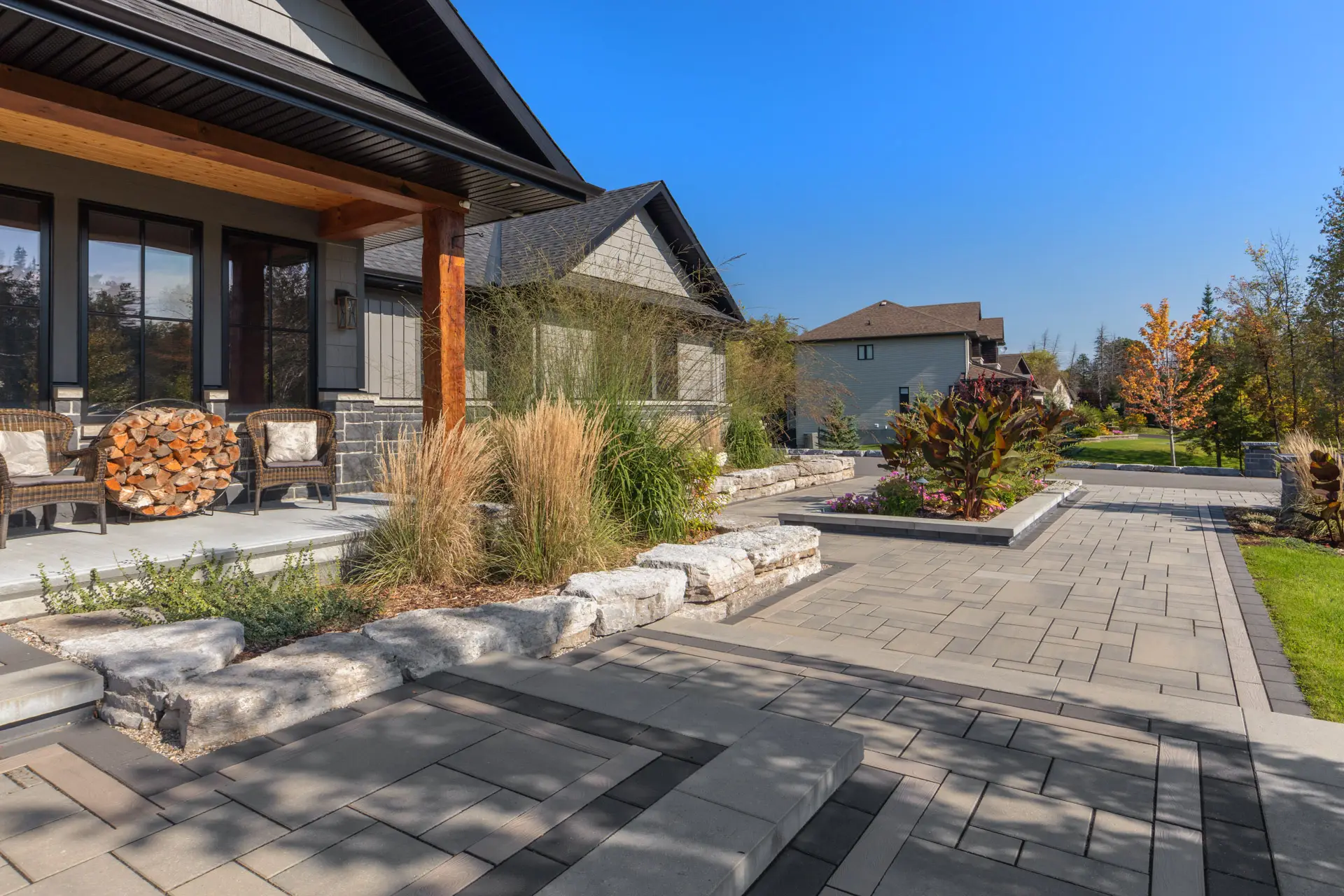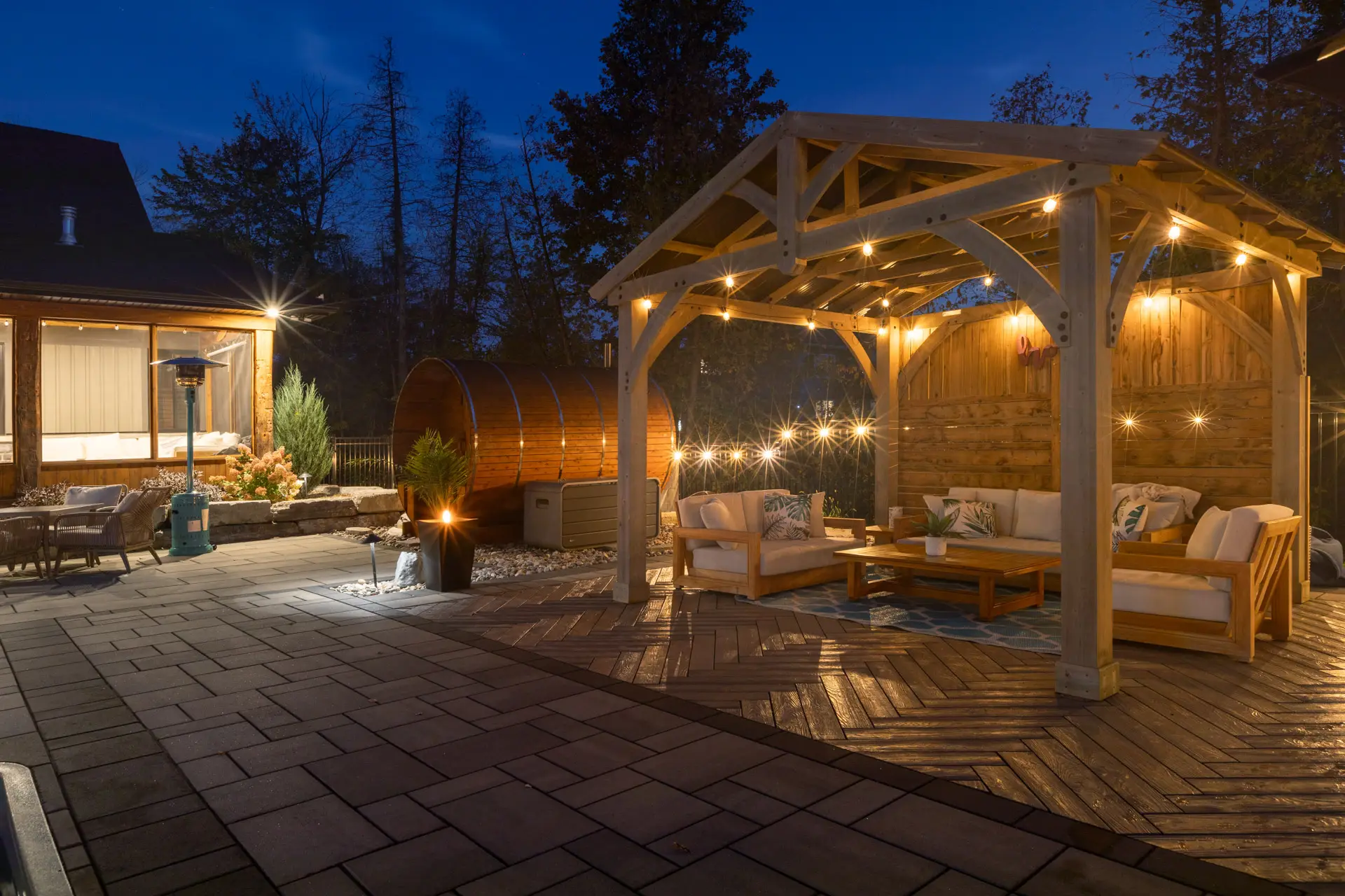 Natural armour stone was used extensively throughout the front and backyard to build strong, textural garden walls that anchor the landscape and reinforce its architectural character. In the front, chunky entry steps were installed to match the scale of the home, while gardens and planting add softness, depth, and a more welcoming sense of arrival. In the backyard, a custom pool with water jets, a gazebo, a sauna, an outdoor kitchen, carefully selected slab inlays, and layered gardens and planting come together to create a highly livable outdoor retreat. Integrated landscape lighting elevates the entire property after dark, giving it the feel of a private resort while highlighting the materials, forms, and setting that make the space so distinctive.