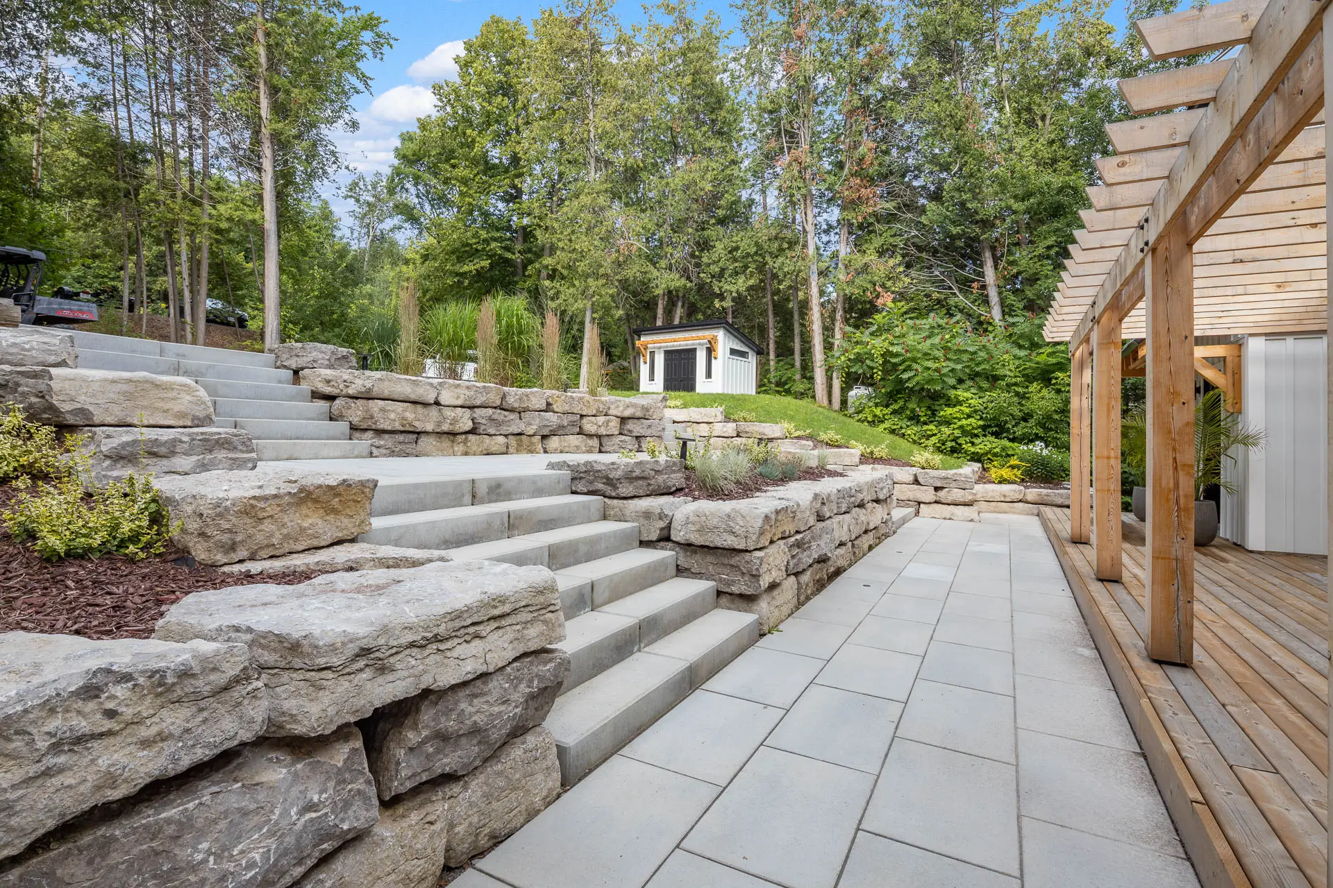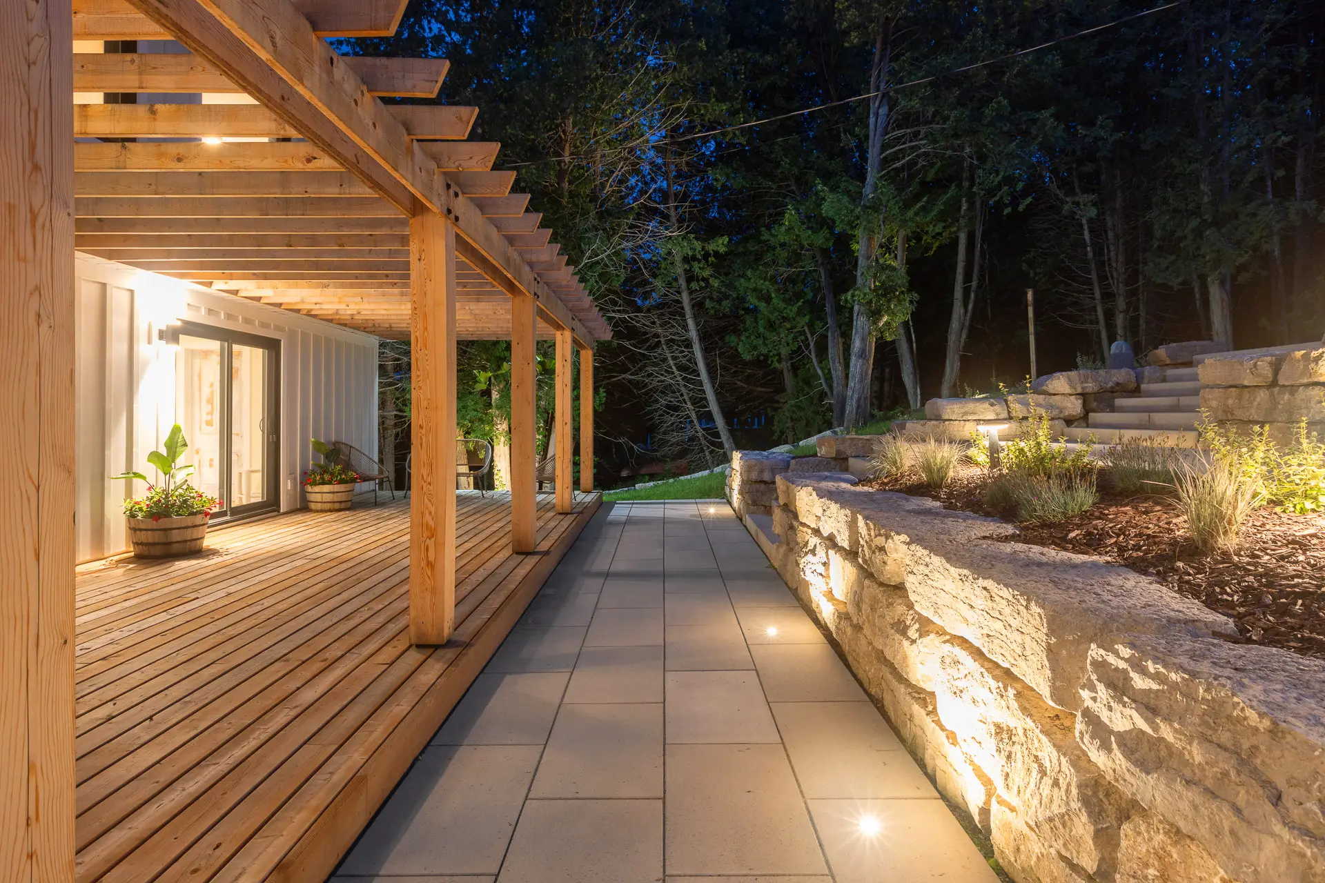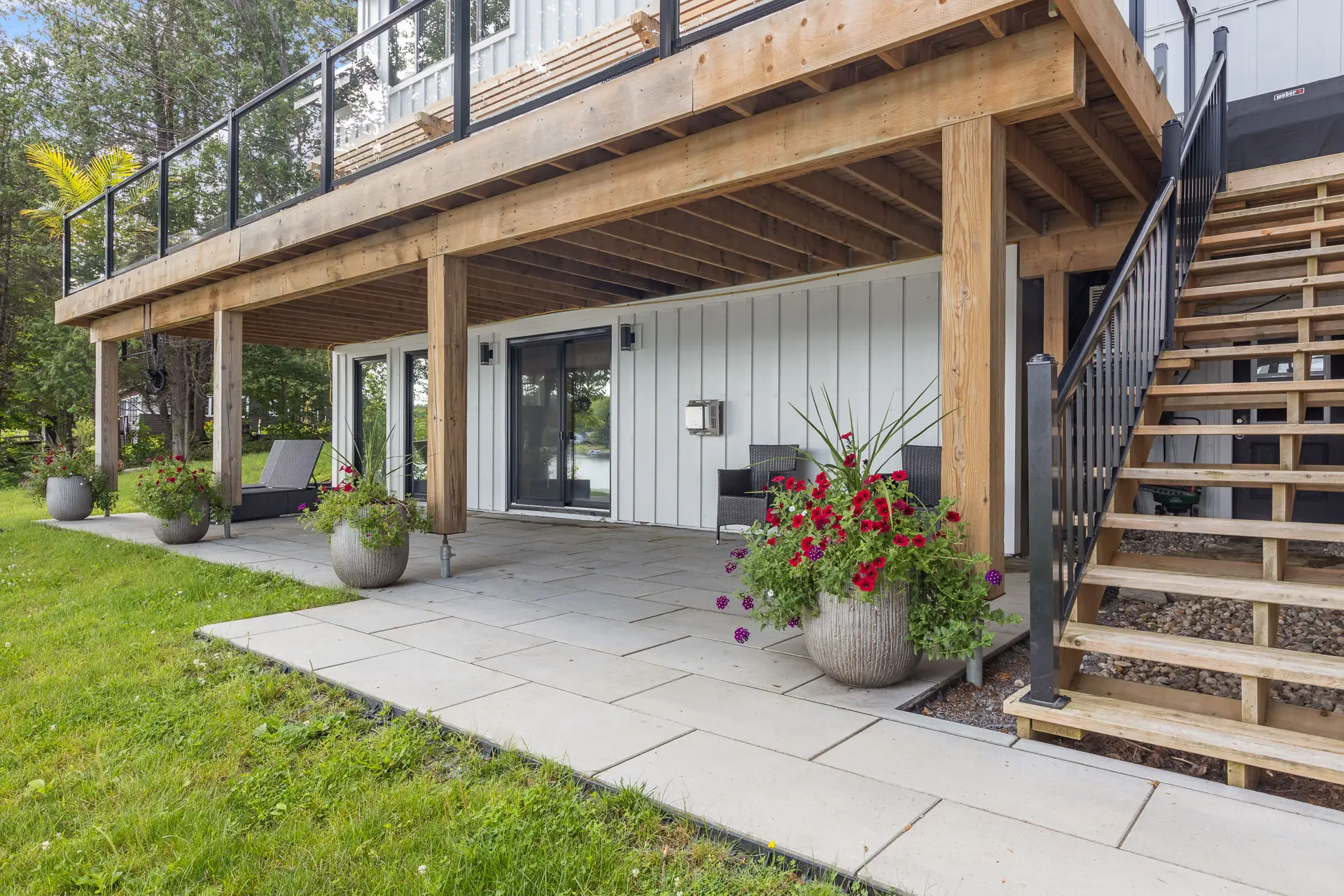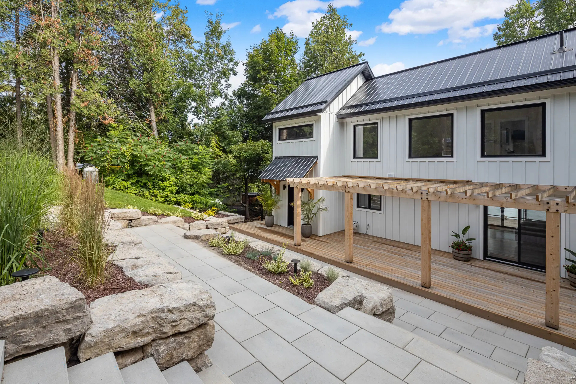Natural armour stone was paired with modern large-format slabs to establish a front entrance that feels both grounded and elevated, offering strong curb appeal and a warm welcome to the property. A beautifully integrated front deck and pergola complement the stonework and create a striking presence, especially when illuminated at night. At the rear, a simple patio and upper dining deck were designed to frame the beauty of the Ottawa River and support relaxed outdoor living. Integrated landscape lighting enhances safety at the front while adding warmth and atmosphere throughout the space.