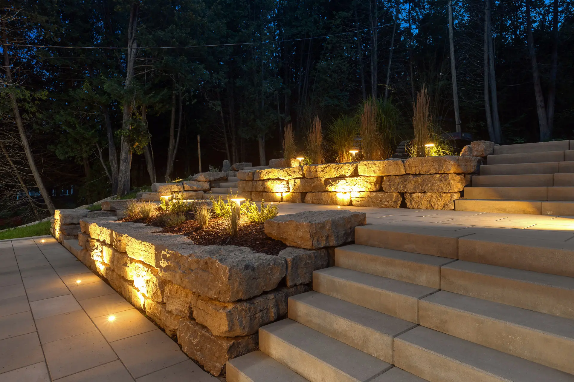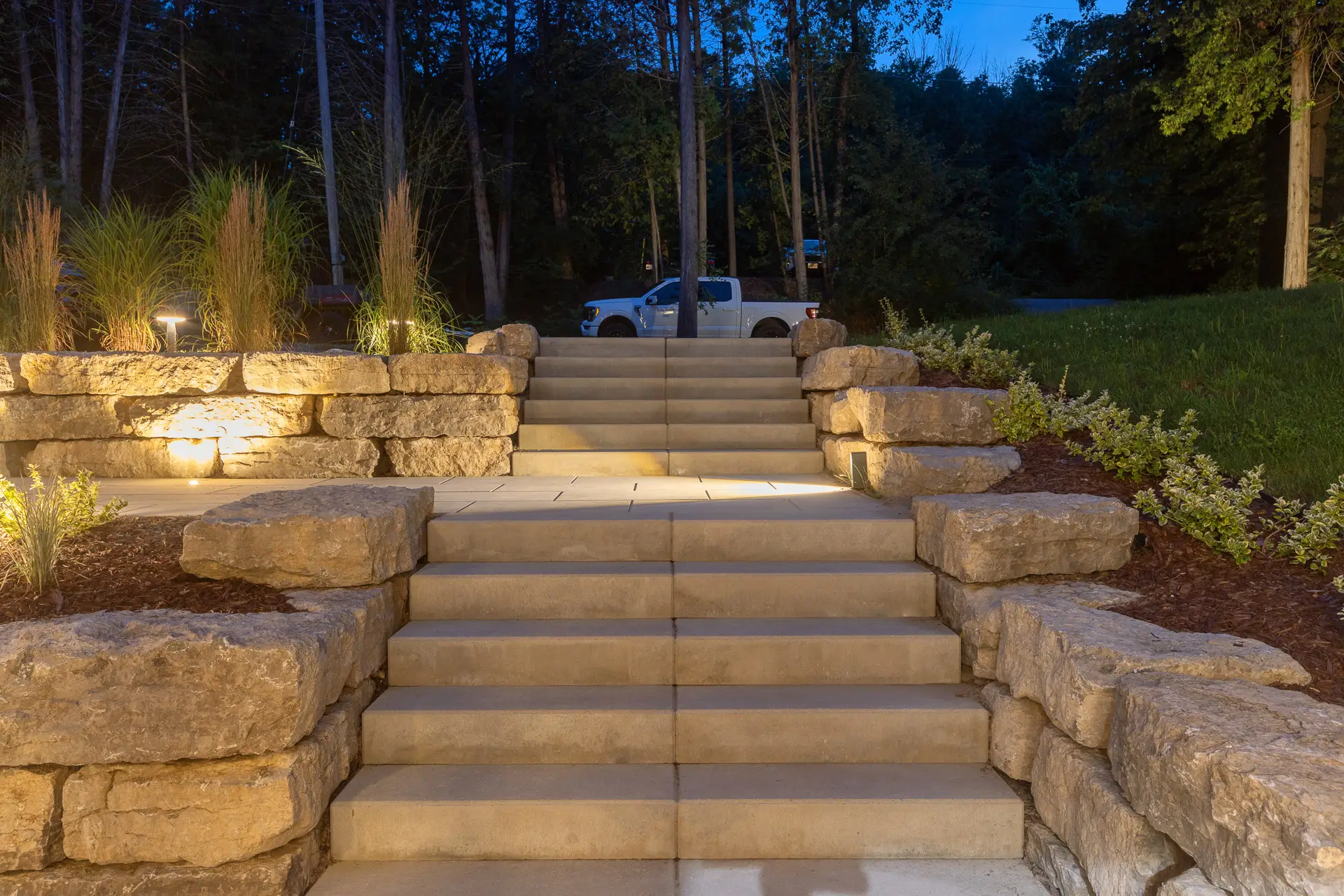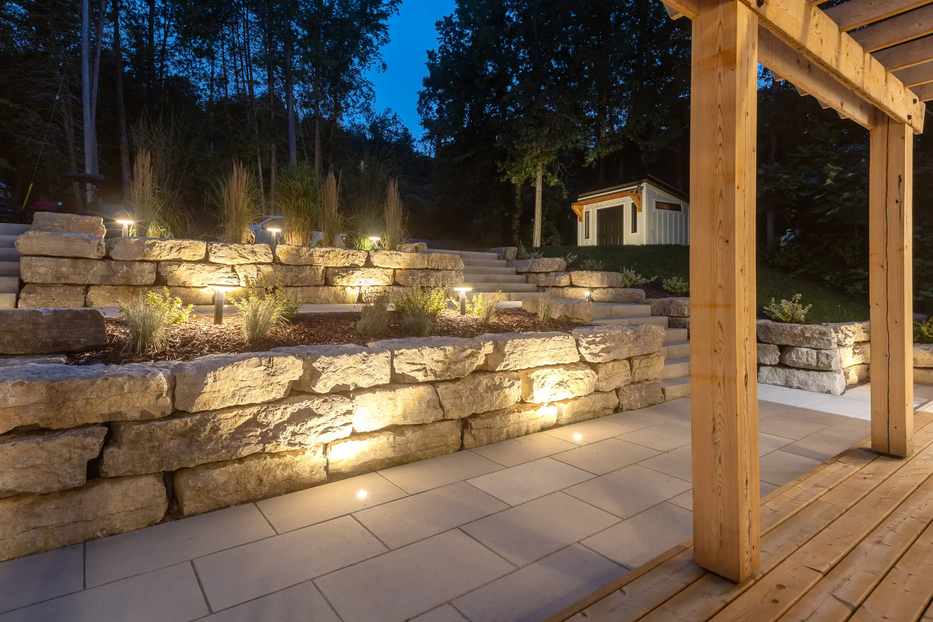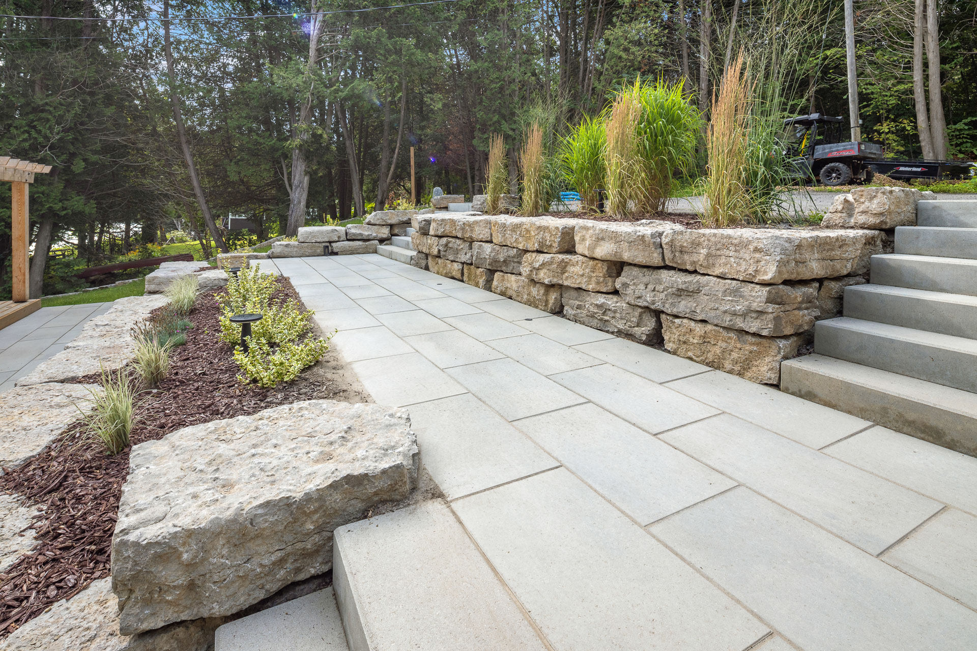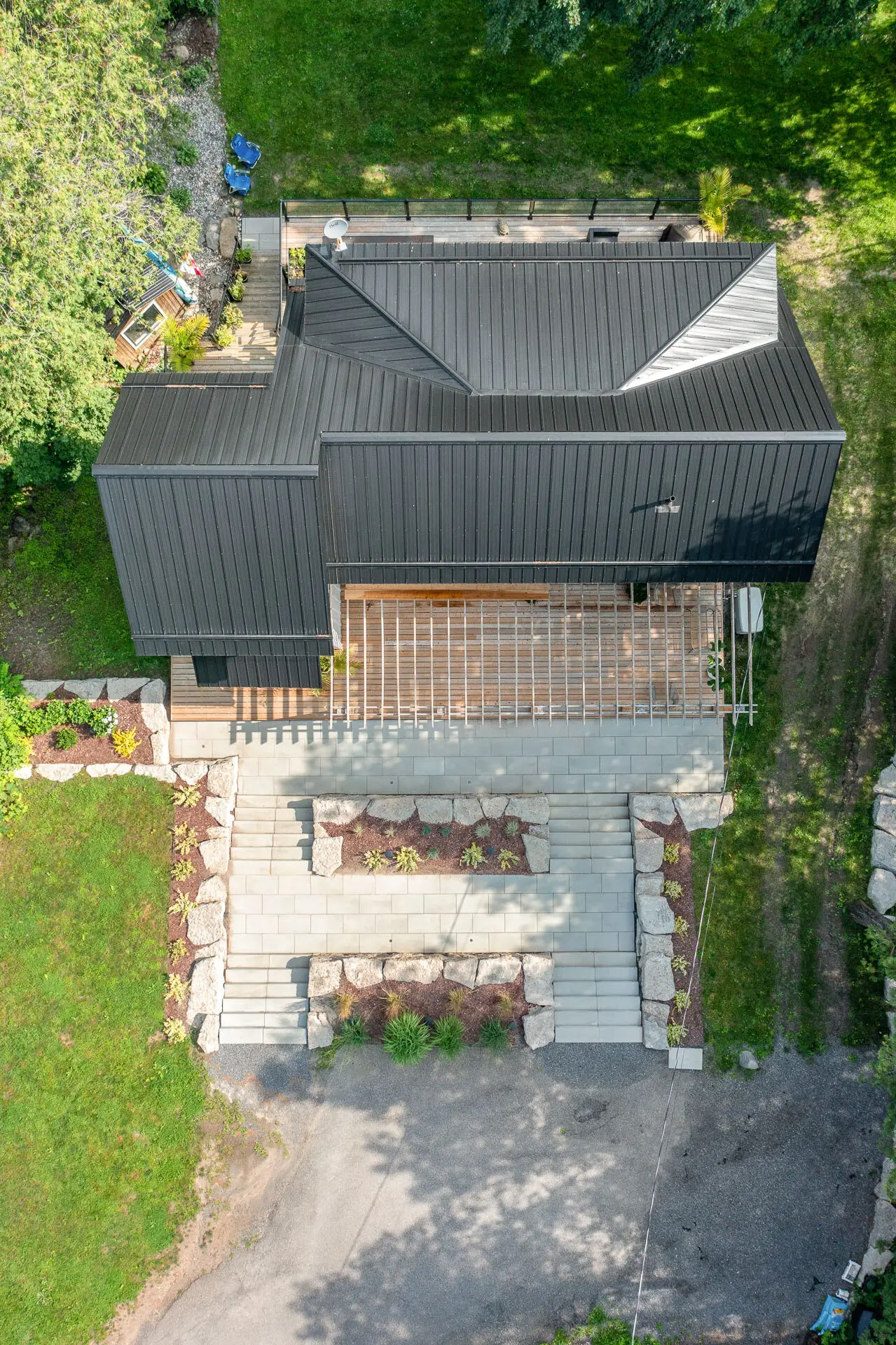 Natural armour stone was paired with modern large-format slabs to establish a front entrance that feels both grounded and elevated, offering strong curb appeal and a warm welcome to the property. A beautifully integrated front deck and pergola complement the stonework and create a striking presence, especially when illuminated at night. At the rear, a simple patio and upper dining deck were designed to frame the beauty of the Ottawa River and support relaxed outdoor living. Integrated landscape lighting enhances safety at the front while adding warmth and atmosphere throughout the space.