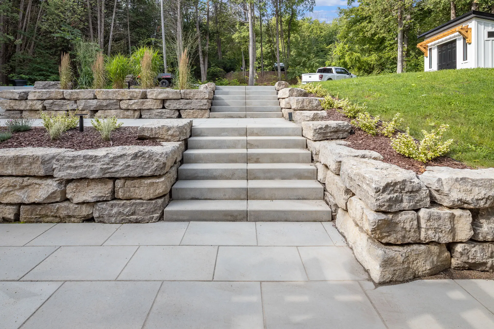 With a dramatic seven-foot elevation change from the driveway to the front door, this project required a front entrance design that would feel safe, substantial, and proportionate to the home. Set against a natural waterfront backdrop, the vision was to create an arrival experience that balanced rugged landscape character with clean architectural detail.